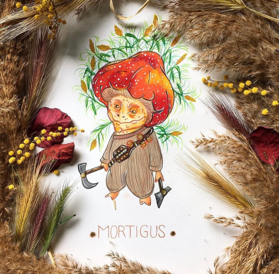 Membre de la communauté des Petits Etres, Mortigus est un Homme-Champignon qui aime par dessus tout cultiver ses terres. Légumes, fruits, céréales, plantes aromatiques (...) tout ce qui pousse et qui se mange n'a pas de secret pour Mortigus. Issu d'une famille de paysans, il n'a pas hésité une seconde à reprendre la ferme de ses parents à leur décès. Il ont malheureusement perdus la vie dans un éboulements de pommes pour humains, laissant leur pioches et semis en héritage à leurs deux fils. En effet, Mortigus a un frère plus jeune que lui, nommé Efergus. Alors que l'ainé est un fermier qui ne peut supporter de s'éloigner de ses champs, le cadet est un fier aventurier qui parcoure le monde. Bien qu'ils soient très différents l'un de l'autre, ils apprécient se retrouver régulièrement pour jouer de la guitare ou partager un dîner Mortigus est une sorte d'ermite qui se contente de cultiver avec amour la terre de ses ancêtres, et d'offrir ses récoltes à chaque habitant du village de Champs-Pignons.