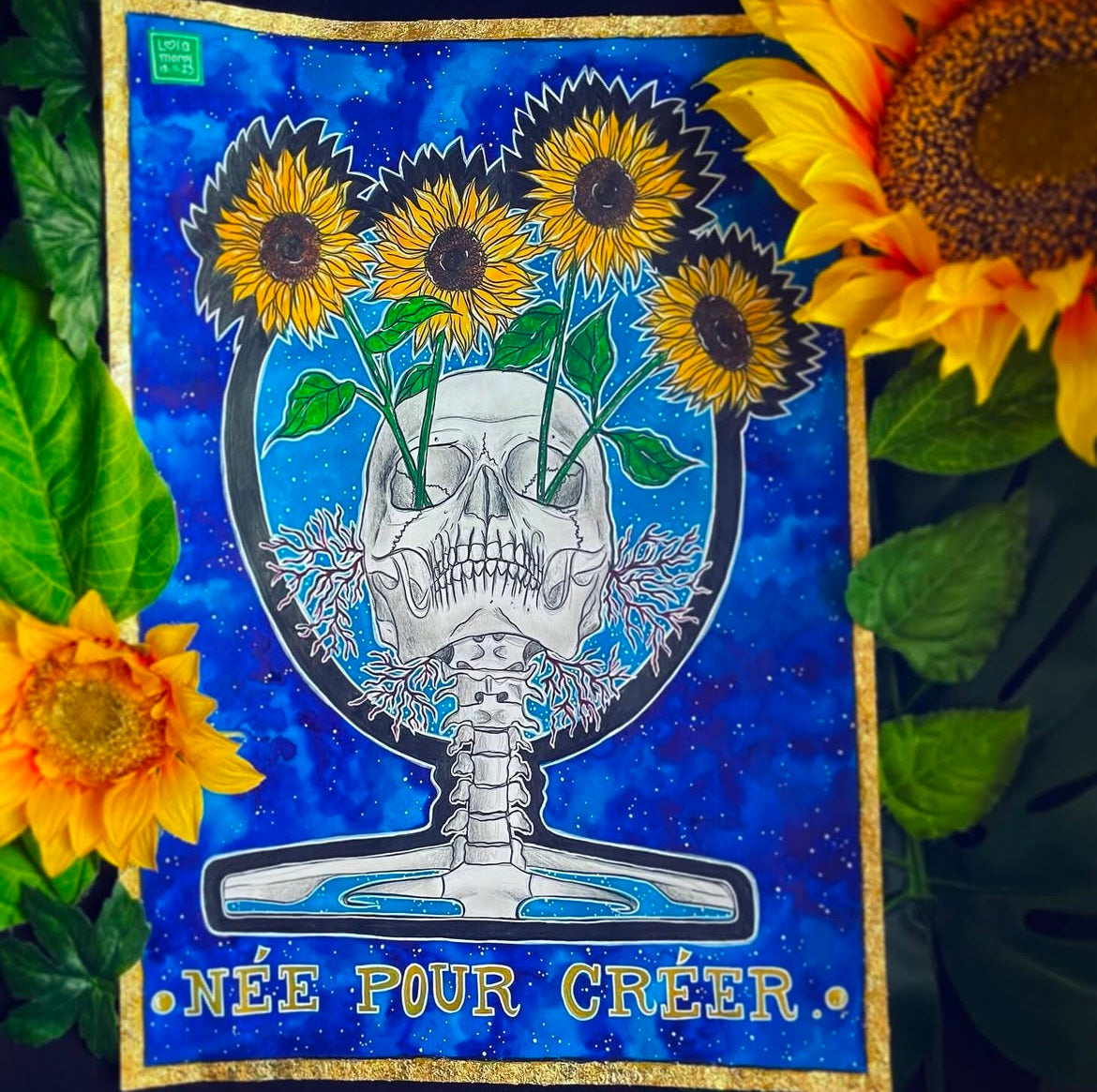Aquarelle, feuilles d’or et crayons de couleurs sur format A3 (29,7x42cm), 2024