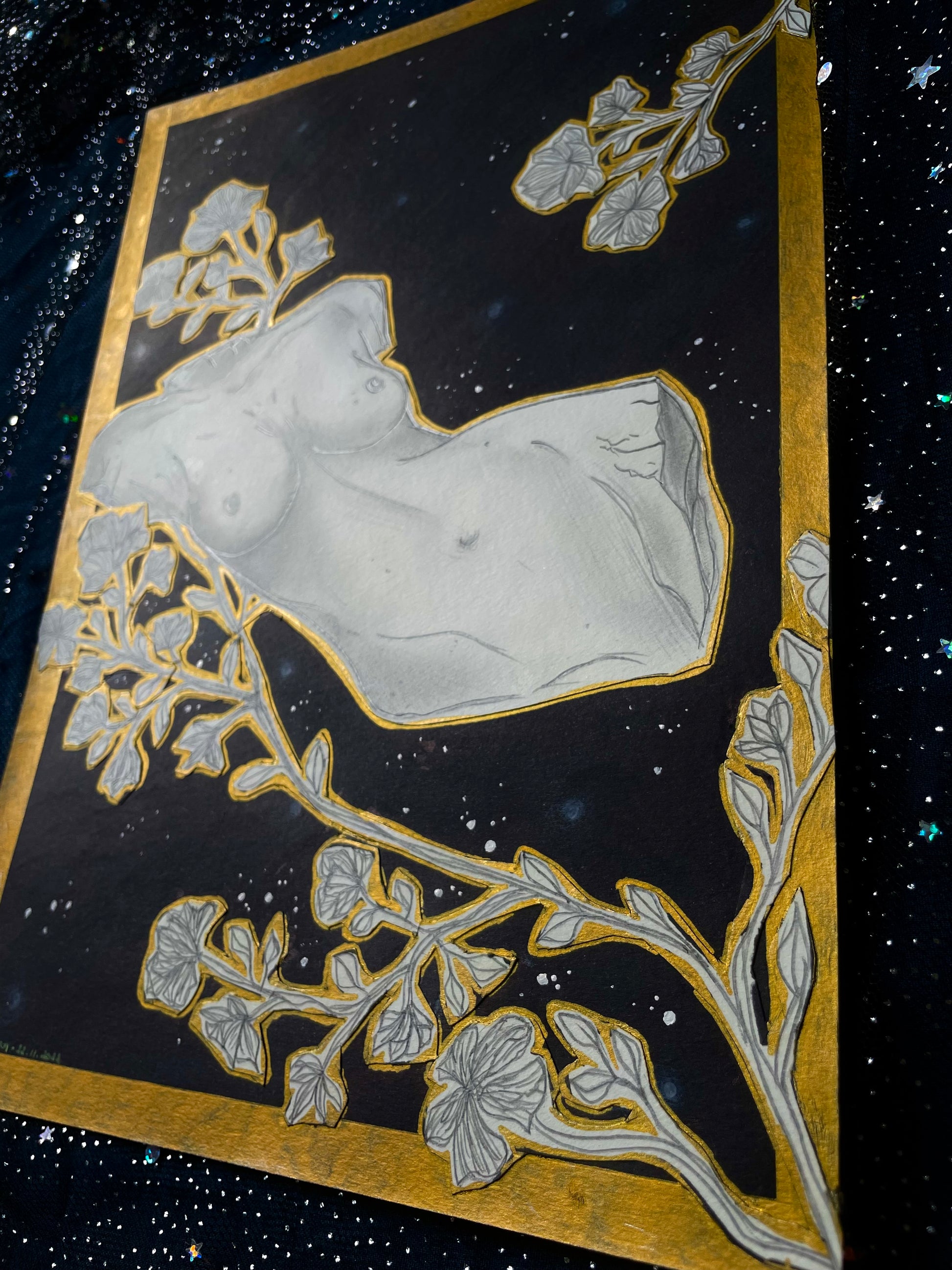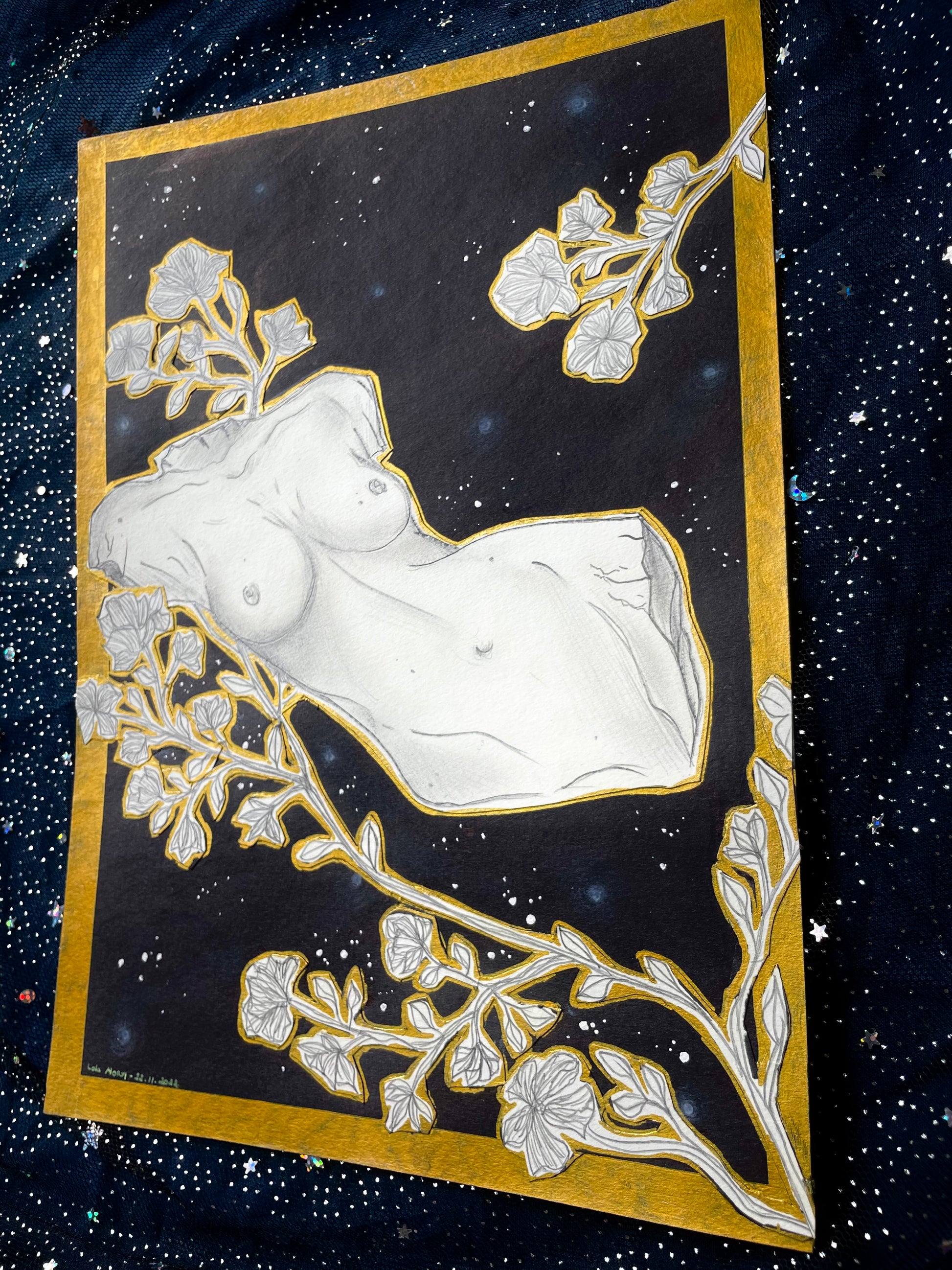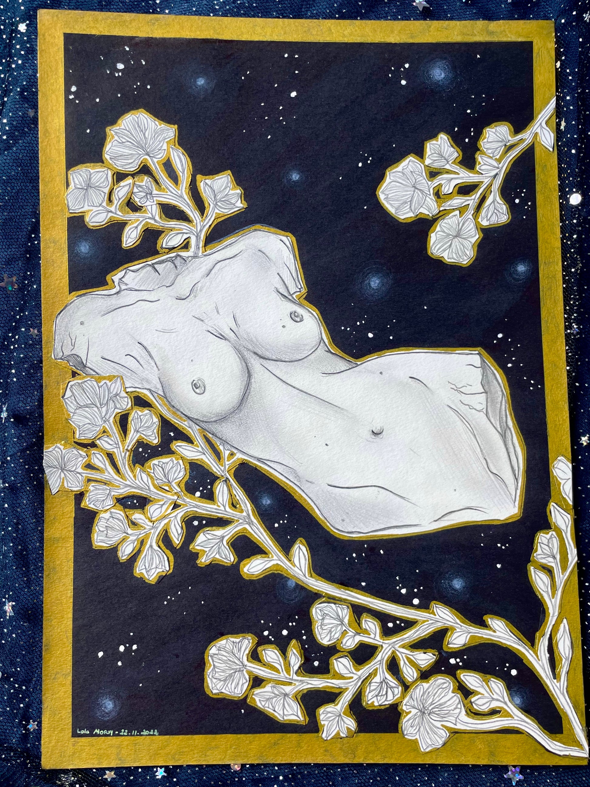 Dessin aux crayons graphite et marqueur noir sur feuille de dessin Canson de format A4, collage, et détails au stylo doré, 2022.
